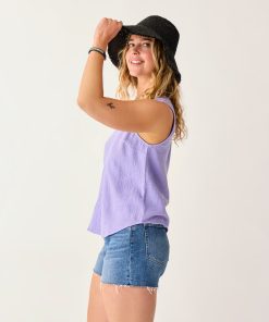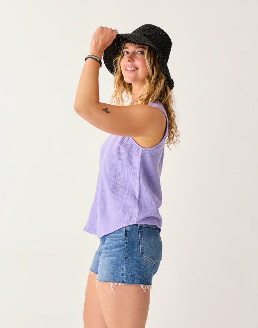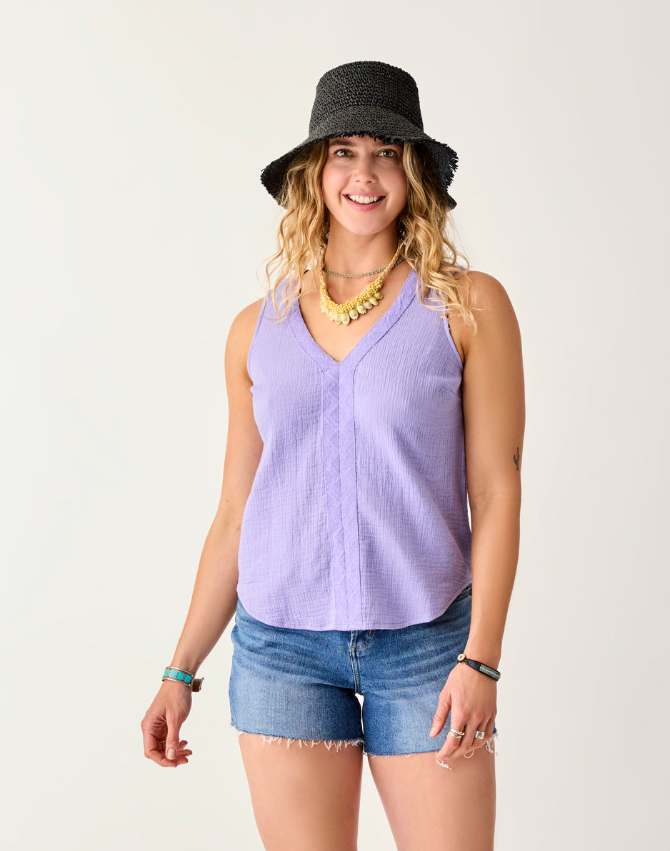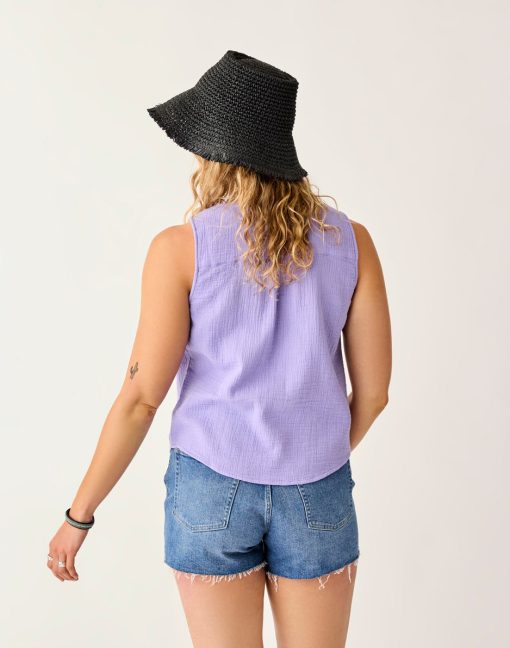 The Kayla echoes the carefree style and grace of summer itself thanks to its 100% organic cotton double gauze, V-neck, shirttail hem, embroidered placket, and acid wash, that gives each piece a unique appearance (excluding Cloud and Tulip).