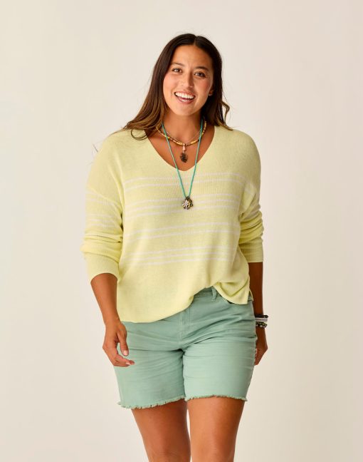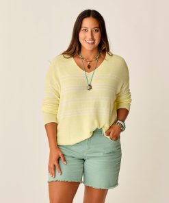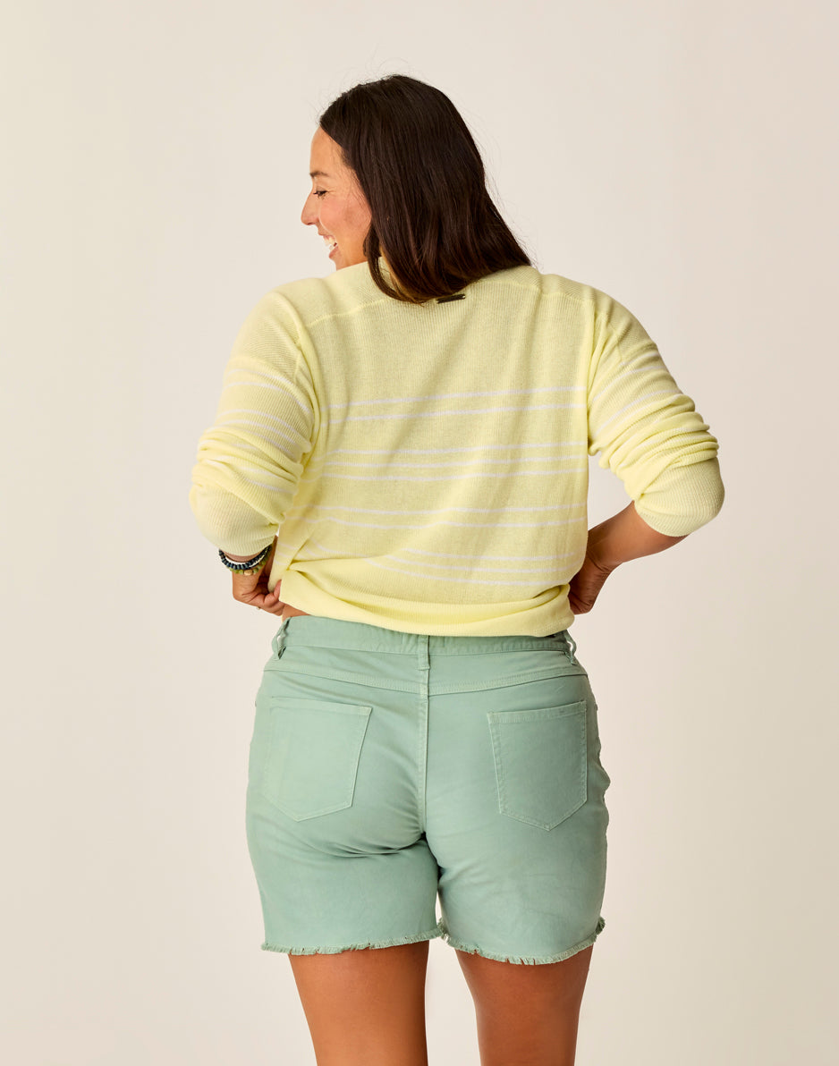 This lightweight 100% cotton sweater saunters into summer with cute, casual confidence. Her subtle back V-neck detail adds a little wink as you walk on by.